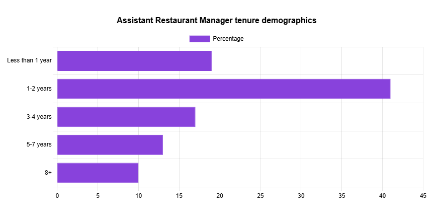 Most Assistant Restaurant Managers (41%) stay with the same employer for between one and two years. This is similar to the Director of Restaurant Operations demographics in the U.S.