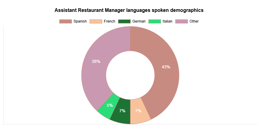Assistant Restaurant Managers in the U.S. speak multiple languages aside from English. The most spoken second language for this role is Spanish (43%), but they also speak several other languages.