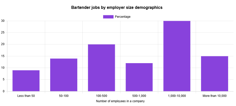 Most Bartenders work in large restaurant chains and establishments. Some 30% are employed in companies with 1,000-10,000 employees. Subsequently, 20% of them work in establishments with between 100 and 500 employees, and just 14% in establishments with 50 to 100 employees.