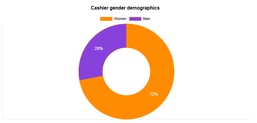 Traditionally, being a Cashier involves providing customer service, which has been culturally associated more with women than with men. As a result, there’s an overwhelmingly large number of women Cashiers (72%) in the industry.