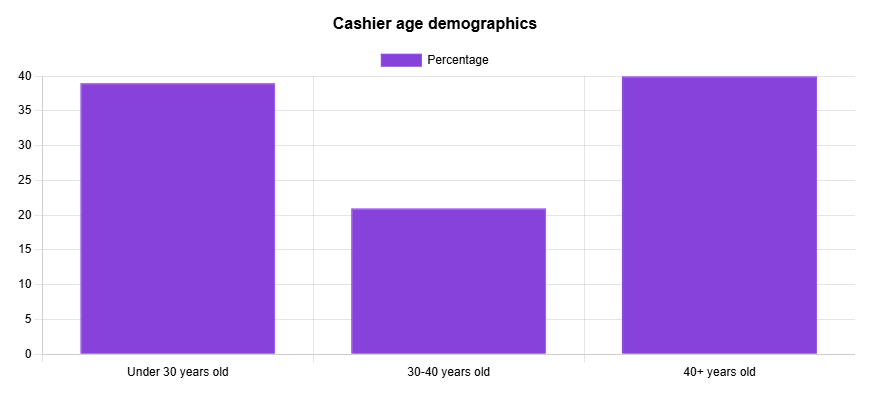 The majority of Cashiers who work in retail, grocery and hospitality are over 40 years old (40%). This is similar to Busser demographics, where most individuals are older than 40.