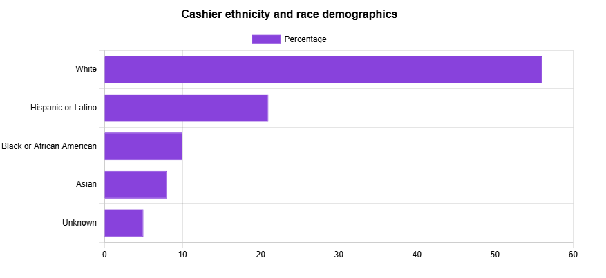 The majority of Cashiers (56%) in the U.S. are white, with smaller percentages representing other races.