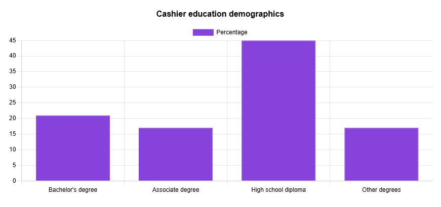 Given this is an entry-level role that’s accessible to many in the workforce, 45% of Cashiers don’t pursue university education and work with just a high-school diploma.