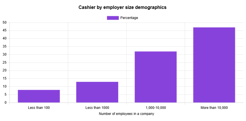 Most Cashiers (47%) work in large companies that employ over 10,000 workers.