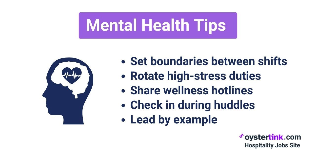 - Post hotlines or mental health apps in breakrooms or staff chats