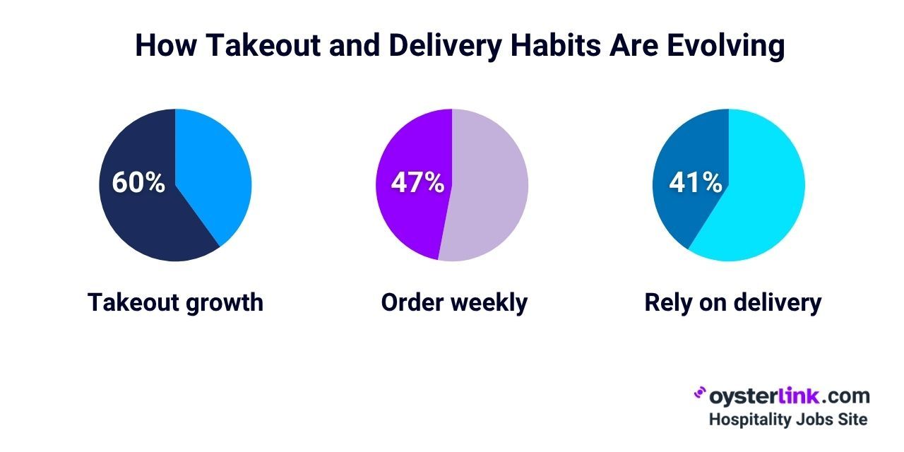 Millennials and Gen Z increased their takeout use by 60% year-over-year. 47% of adults order takeout weekly, and 41% consider delivery essential.