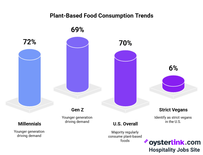 In the U.S. overall about 70% of people now regularly consume plant-based foods and roughly 6% identify as strict vegans. In NYC these trends are visible in diet and searches (New Yorkers Googled vegan terms at some of the highest rates nationwide).